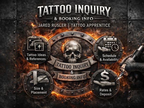 Jared Rusler is a tattoo apprentice at Ink Me Tattoos. To ensure a smooth booking process and respect everyone’s time, the following policies apply: